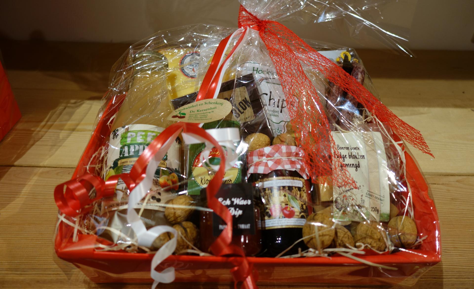 Er zijn een aantal themapakketten die grotendeels voorradig zijn, zoals een mand met kersenproducten, een appelbak gevuld met appel gerelateerde producten, een pakket om pannenkoeken te bakken of een smaakvol bierpakket met o.a. bierkaas. Daarnaast kunt u natuurlijk ook zelf een keuze maken van producten die wij vervolgens feestelijk verpakken. Zelfs wanneer u aan het einde van het jaar mensen wil bedanken met een kerstpakket, bent u bij ons aan het goede adres. Wij helpen u graag met het samenstellen van een pakket wat voldoet aan uw wensen, en waar u iemand uiteindelijk blij mee maakt!